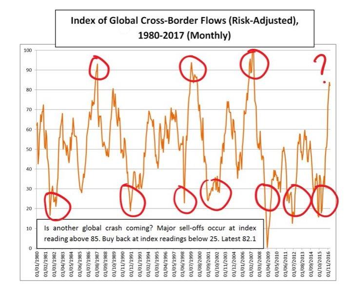 Alarming results for the latest cross border flows from CrossBorder Capital...this sort of spike hasn't boded well in the past. However, the VIX is remaining in the 10 to 14 band it has been in since late 2016. Mixed messages. Keen to get peoples thoughts.